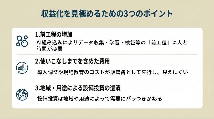 運用支援やソフトウェアの継続課金モデルへ転換できなければ、AI投資の成果が損益に表れるまでに時間がかかってしまう。さらに、導入時の調整や現場教育にかかるコストは販管費として先行し、外部からは収益化の進ちょくが見えにくい点も留意が必要である。