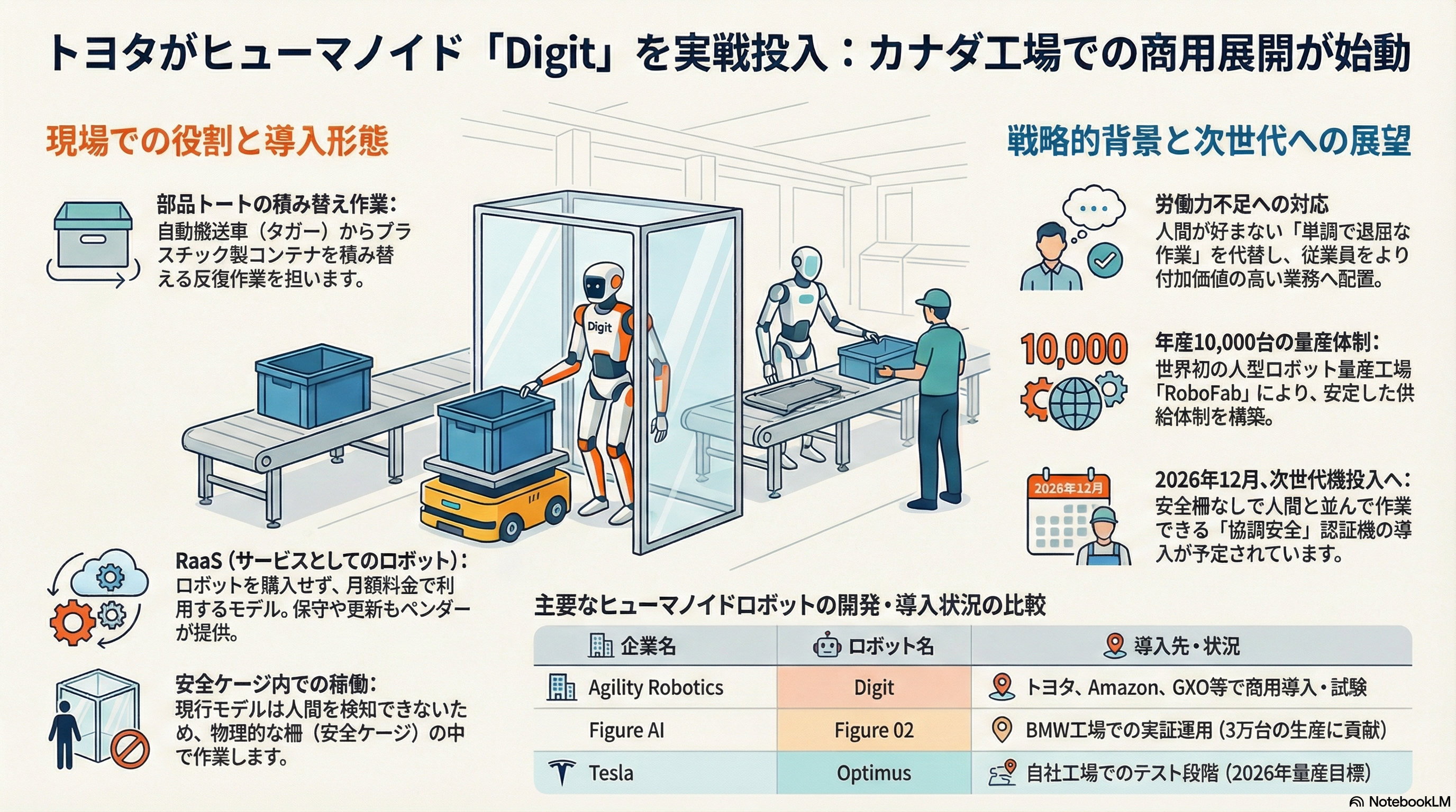 カナダの自動車製造業において、ヒューマノイドロボットが試験段階から商用運用へと移行する先進的な事例となる。4月初旬からは7台のDigitが組立ラインに配備される計画であり、タガーと呼ばれる自動搬送車から部品を収納したプラスチック製コンテナを積み替えるといった、限定的で反復性の高い作業を担う 。世界的な労働力不足が課題となる中で、単調なプロセス作業を自動化し製造効率を維持する狙いがある。