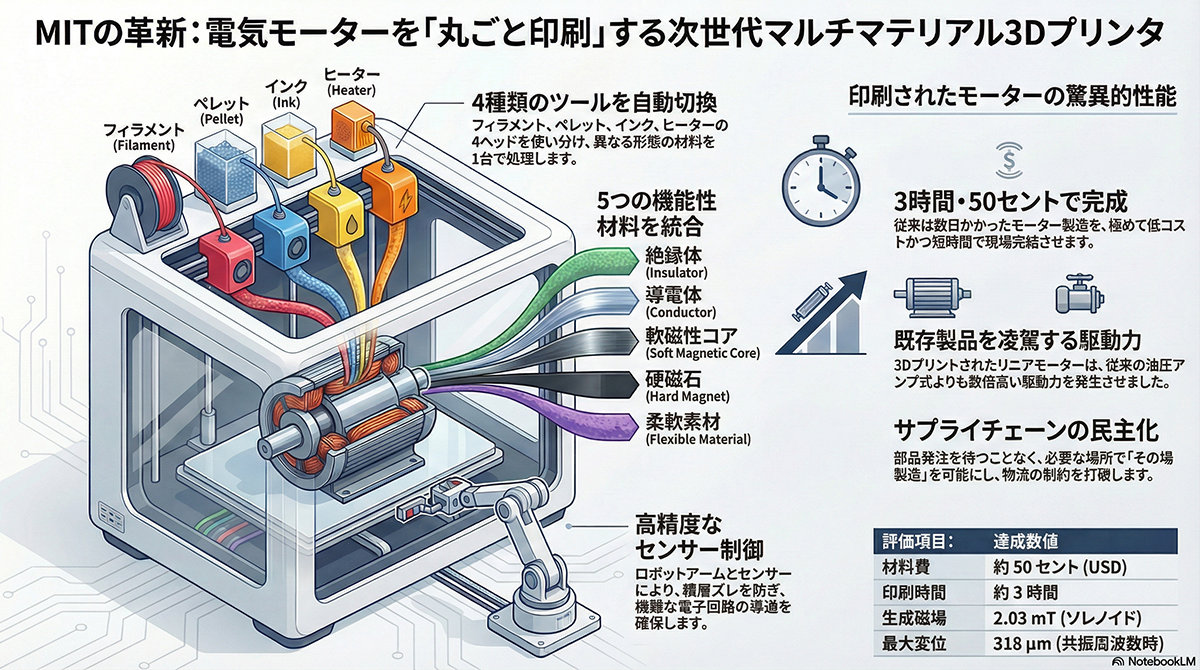 この技術の確立により、工場の生産ラインでモーターが故障した際にも、データを用いて現場で即座に交換部品を製造し、生産の停止を防ぐことが可能になる 。研究チームは今後、着磁プロセスを印刷中に統合する技術や、回転式電気モーターの出力にも取り組む計画である 。ハードウェアを現場で一段階で製造できる本技術は、グローバルなサプライチェーンへの依存を低減し、オンデマンド製造を推進する重要な基盤となる。