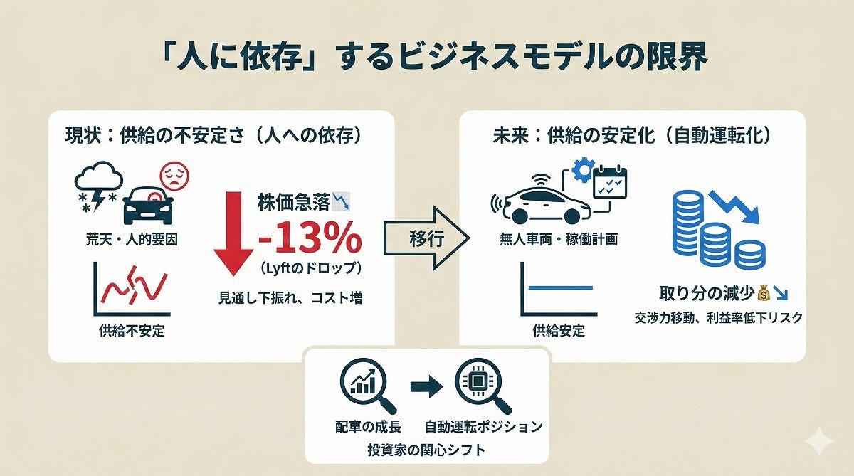 論点は「需要の強さ」ではなく「供給の不安定さ」だ。人が運転する限り、労働時間の上限、地域ごとの規制、事故リスク、そして天候といった外乱が、供給を一気に細らせる。
