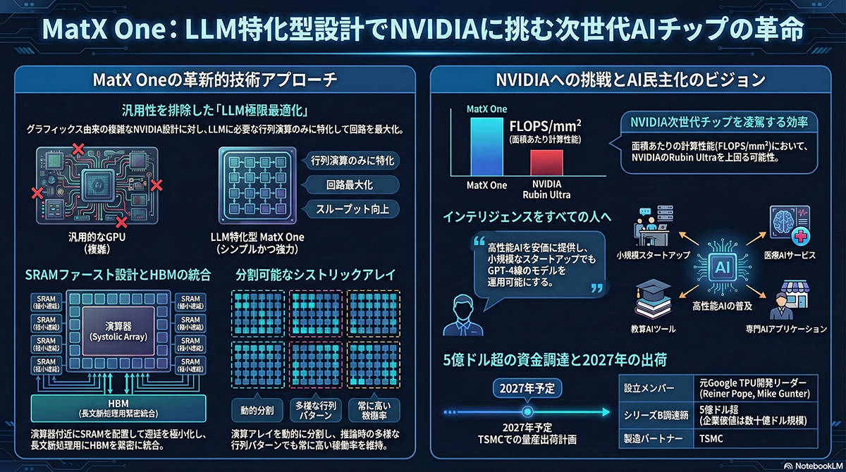 同社が開発を進めるプロセッサ「MatX One」は、汎用性を意図的に排除し、大規模言語モデル(LLM)の推論および学習処理に極限まで特化している点が最大の特徴である。具体的には、演算器の近傍にSRAM(静的ランダムアクセスメモリ)を配置して遅延を最小化する設計と、膨大なデータを保持するためのHBM(高帯域幅メモリ)を統合するデュアルアプローチを採用している。また、巨大な行列演算に優れたシストリックアレイを動的に分割して利用可能にすることで、推論処理時の演算器の稼働率とエネルギー効率を高く維持するアーキテクチャを実現した。