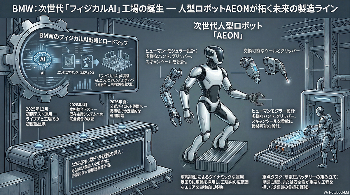 具体的な用途としては、高電圧バッテリーの組み立てや外装部品の製造工程などでの活用が検証される。今回の導入は、BMWが推進する「フィジカルAI」戦略の欧州における初のパイロットプロジェクトとして位置付けられている。フィジカルAIとは、デジタル領域の人工知能と現実の機械を組み合わせ、自律的に学習・判断して複雑なタスクを処理するシステムを指す。