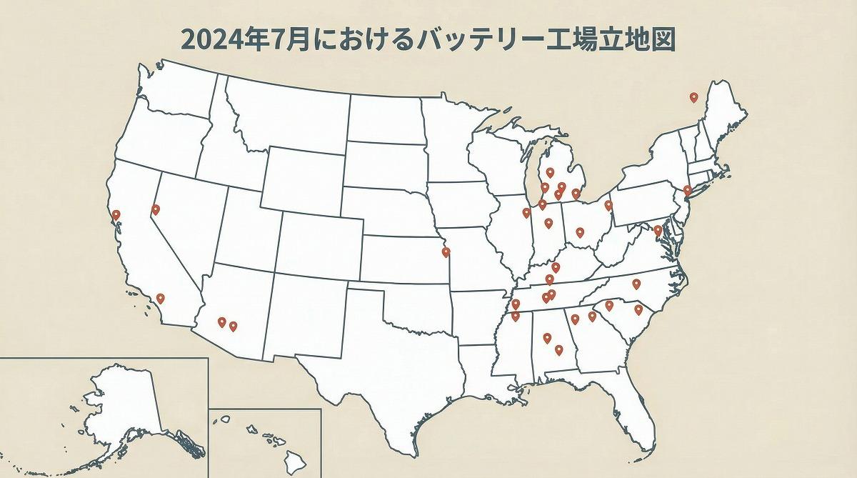 まず、バイデン前政権が2期目を目指していた2024年7月に、全米で計画中・建設中・稼働中であったバッテリー工場を地図上の点で表した図1を見ると、自動車産業が盛んな中西部と南部を中心に34の事業所が展開中あるいは予定されていたことがわかる。また、第2次トランプ政権発足直後の2025年2月にまとめられた記事によれば、GM、フォード、ステランティス、テスラ、ホンダ、トヨタ、韓国ヒョンデなどの自動車メーカーに加えて、パナソニックや韓国LGエナジーソリューション、韓国SKオンなど蓄電池メーカーによる工場がすべて稼働すれば、合計の年間製造能力が当時のおよそ2倍である合計421.5ギガワット時に達する予定であった。