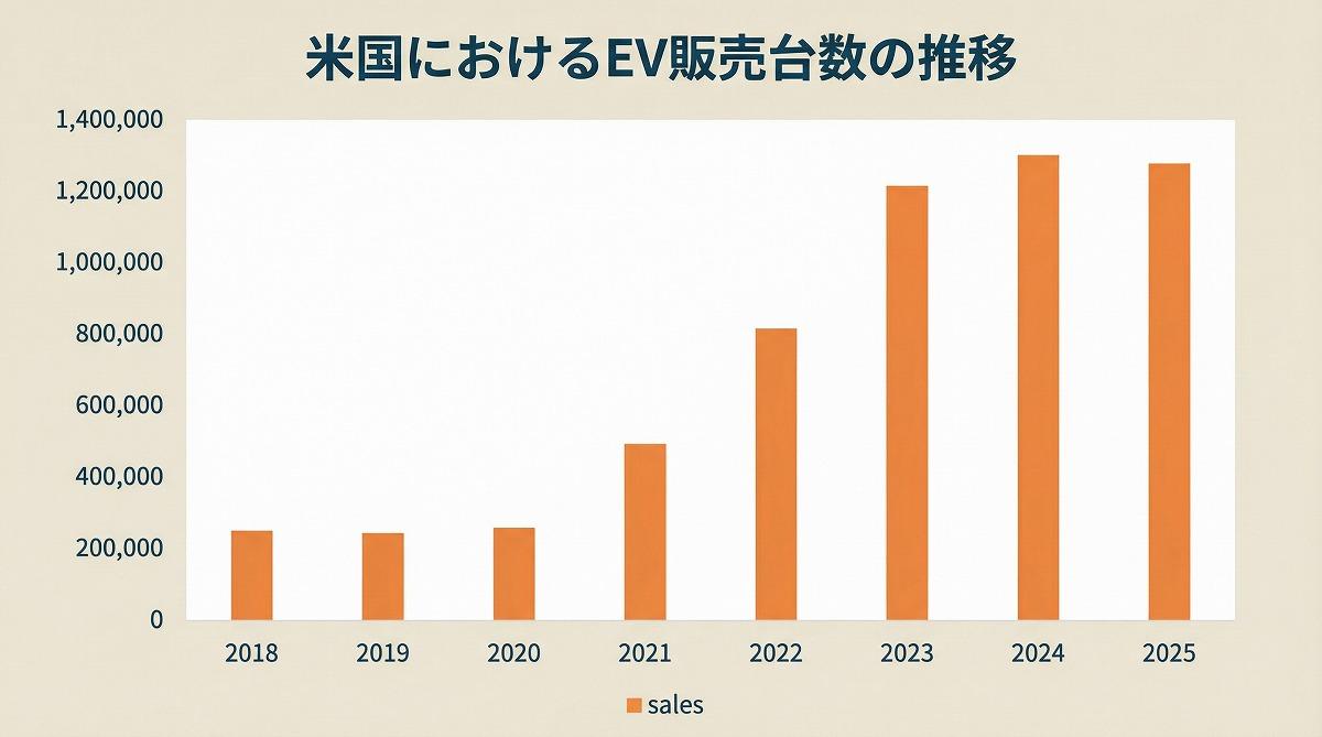 ところが、米国におけるEV販売は2023年から頭打ち傾向が顕著になっており、2025年9月末で1台当たり最大7,500ドル(約120万円)の税額控除(補助金)が廃止されるに至り、年間販売台数が前年を下回るなど、需要の大きな伸びが見込めなくなった(図2)。