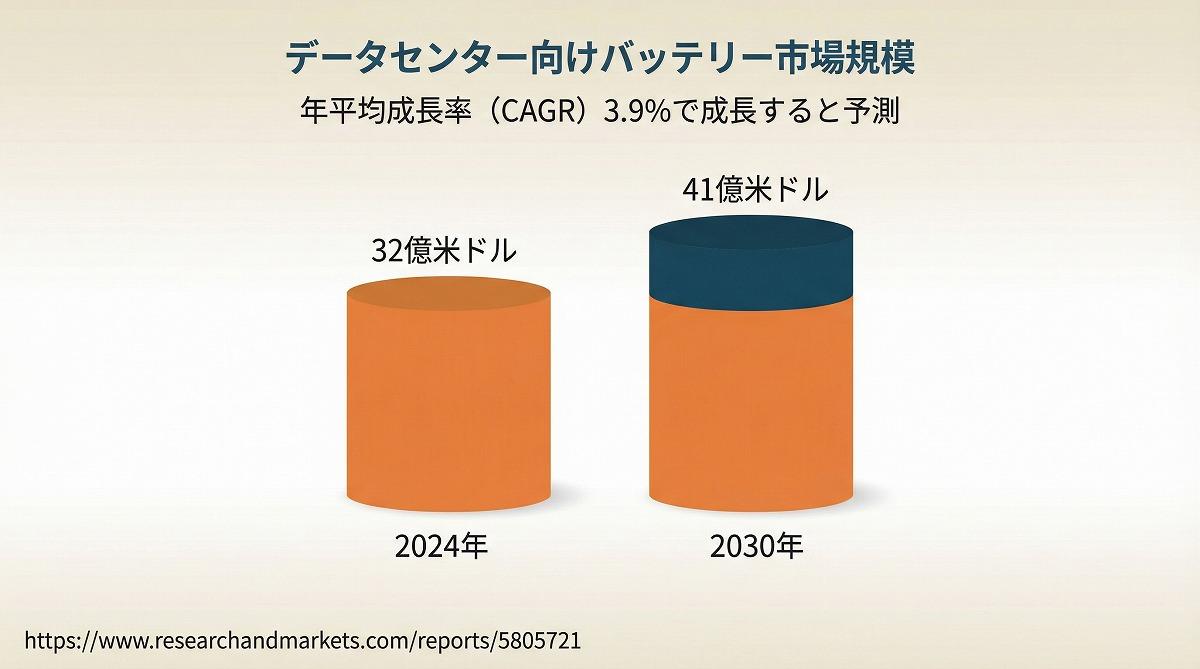 このため、米データセンター向けバッテリー市場の規模は、2024年の32億ドル(約5,020億円)から年率3.9%のペースで伸び、2030年には41億ドル(約6,430億円)に成長すると、米市場調査企業のResearchAndMarkets.comは予想している(図4)。