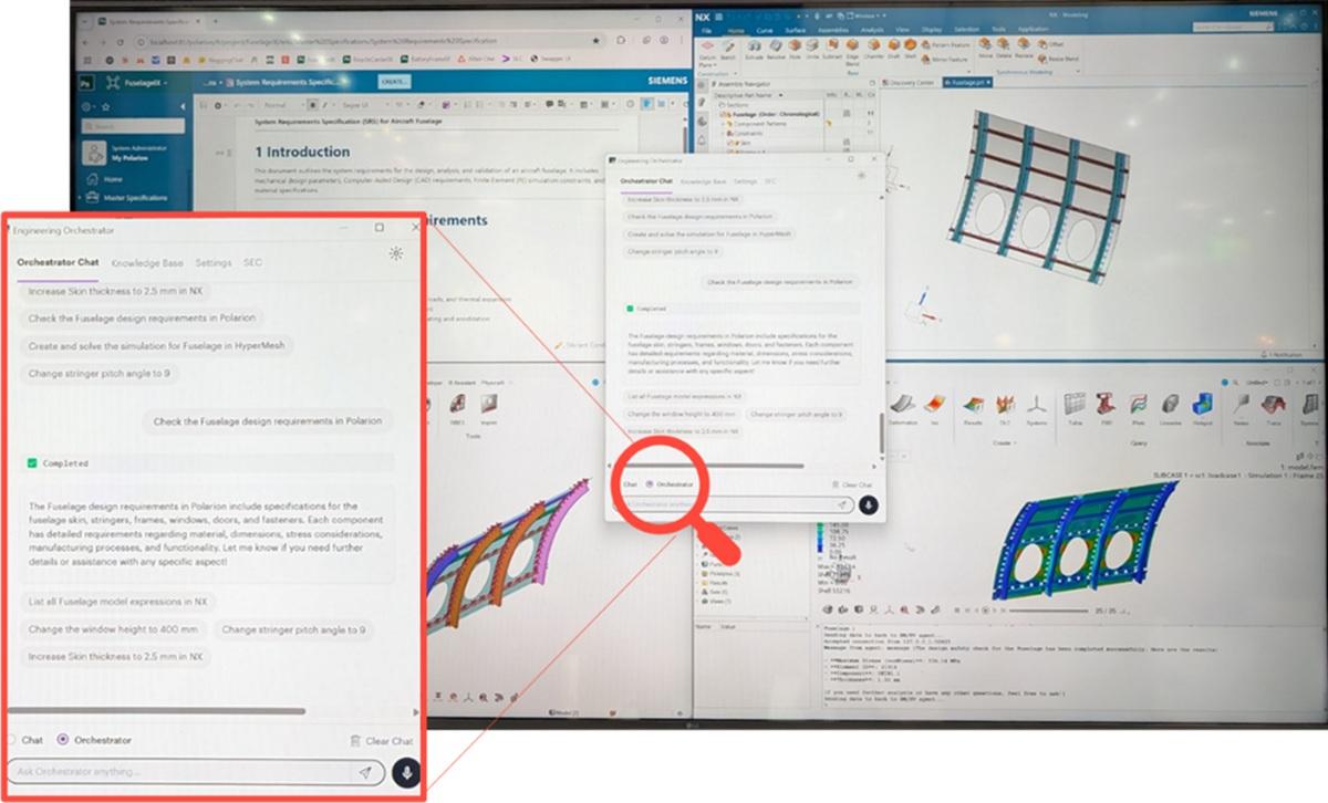 ハノーバー・メッセ2025において、IoTアナリティクスが観察した展示の大半は基本的なオーケストレーション機能のみを実演していました。有望な展示の1つがアクセンチュアの「エンジニアリング・オーケストレーター」で、ユーザーが自然言語を用いて設計変更を行える機能を備えています。エージェント型エンジニアリングチャットボットは既存ツールの上位制御層として機能し、ユーザーのプロンプトを解釈しながらシーメンスNXやアルテアHyperMeshなど複数ツールを並行して操作し設計変更を実行します。
