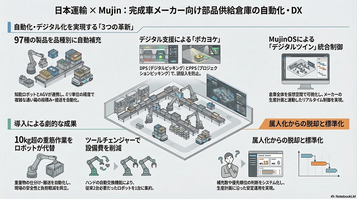 総合物流企業の日本運輸は、関東圏の完成車メーカーで拡大する変種変量生産に対応するため、部品供給倉庫の抜本的な改革に踏み切った。近年、自動車産業では消費者のニーズ多様化や製品サイクルの短縮を背景に、単一ラインで複数の車種を組み立てる混流生産が主流となっている。部品供給の現場には生産計画の変動に応じた柔軟な対応が求められる一方、作業の多くは人手や熟練作業員の判断に依存していた。将来的な労働力不足を見据え、同社は重量物の運搬作業の自動化と、属人化しやすい判断業務のデジタル化に着手した。Mujinとの連携により実現した物流革新は、大きく3つの要素で構成される。