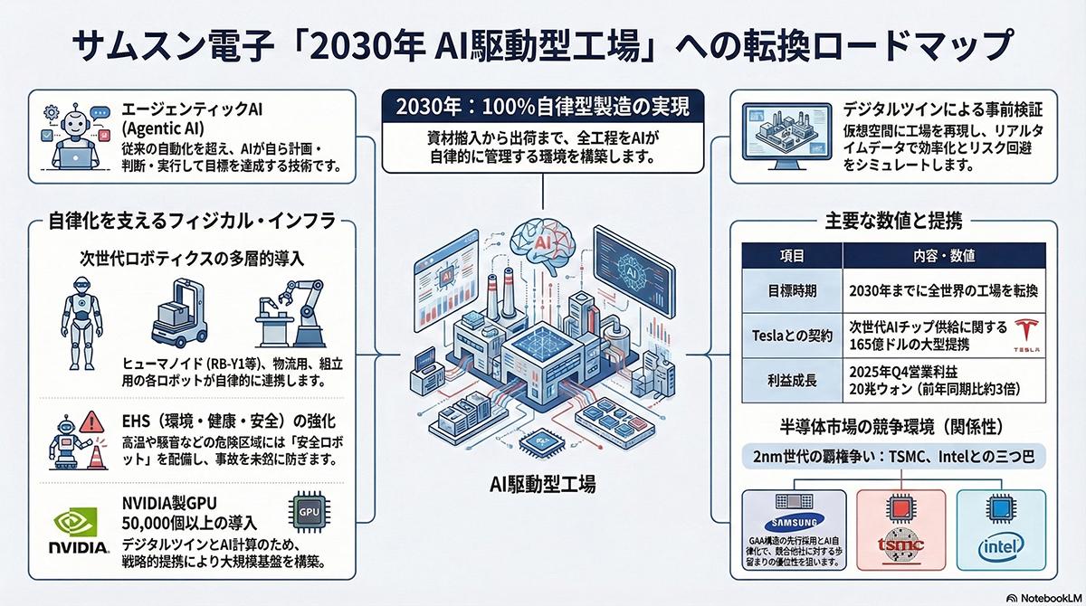 モバイル事業で蓄積した知見も製造現場に応用する。最新スマートフォンGalaxy S26で採用した自ら目標を設定し計画を自律的に実行するエージェンティックAIの技術を製造設備や修理、物流システムに組み込む。この技術により指示を待つのではなく自ら判断して動くシステム基盤を現場に整備する。さらに単純な自動化から完全な自律化への移行を見据え、人型のヒューマノイドロボットをすべての製造プロセスに段階的に導入する。