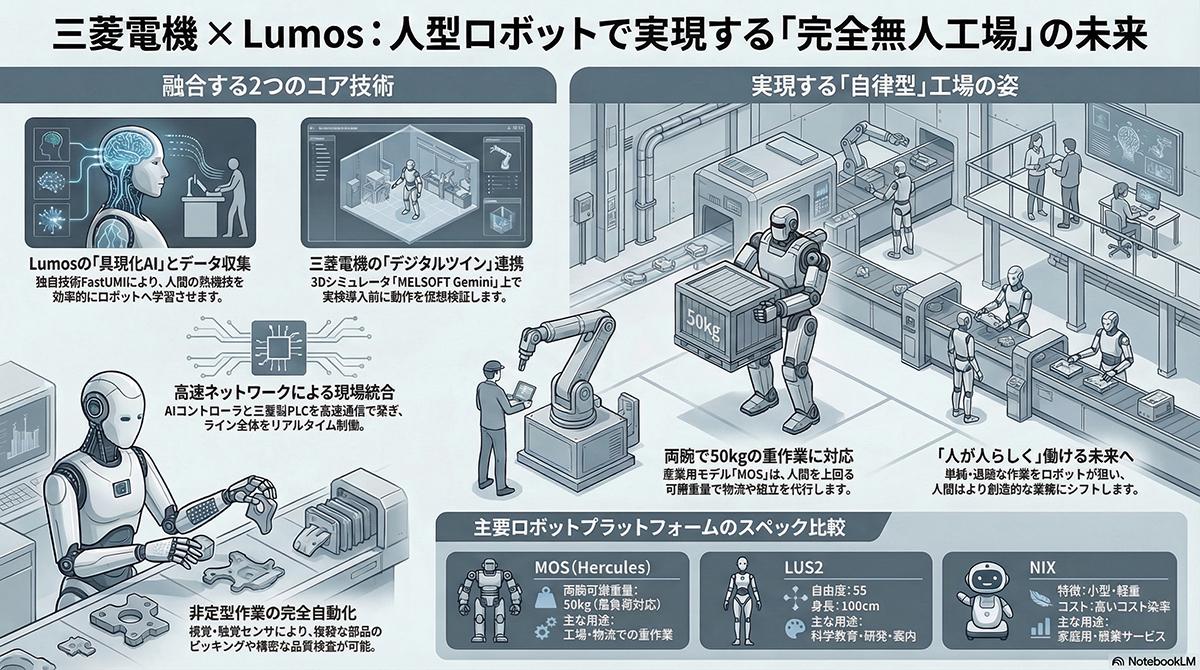同社は人型ロボットの開発にとどまらず、AIを活用した独自の高精度なデータ収集技術を保有している。三菱電機は、自社がFA分野で培ってきた生産ライン自動化の専門知識と、Lumos社の持つ先進的なロボット技術およびAIを融合させる方針である。