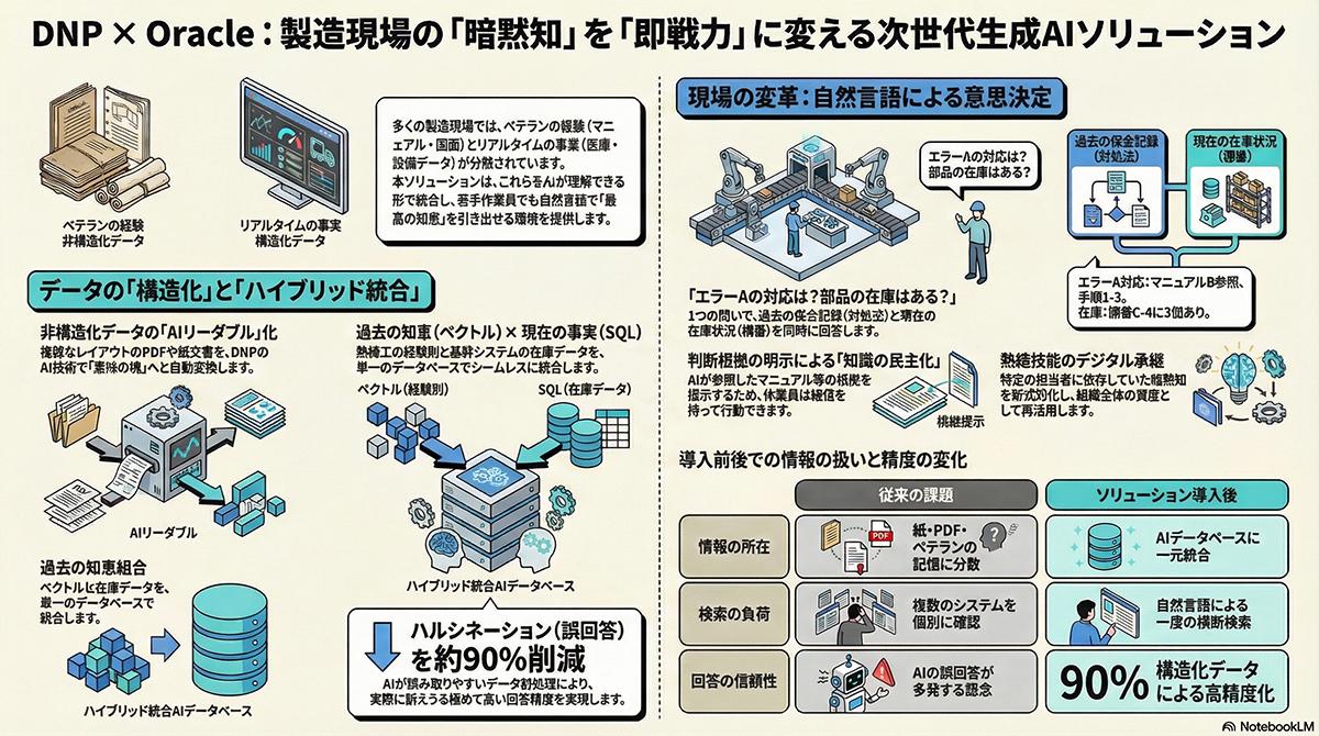 今後登場する新たなAIモデルの取り込みや、自律的に業務をこなすAIエージェントの開発にも対応する。専門的なITスキルを持たない現場の担当者でも、自然言語による検索や対話型の操作を通じてシステムを利用できる。これまで企業内に蓄積されながら十分に活用されていなかった非構造化データを知識資産として再利用し、生産現場の改善や高度な判断に直結させる。大日本印刷はオラクルと連携し、まず製造業を中心に熟練工のノウハウ共有や設備保全の用途で導入を進める。その後、判断の根拠や正確性が強く求められる金融機関や自治体へ展開を広げる。同社は関連サービス全体で2030年度に50億円の売上を見込んでいる。