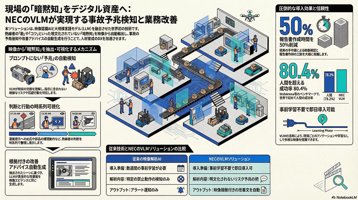 NECが新たに開発した技術は、映像認識AIとLLMを高度に融合させることでこの課題に対応する。カメラが捉えた映像データから作業者の行動や周囲の環境変化を細かく分析し、これまで熟練指導員が目視で行っていた高度な状況判断をAIが代替する。これにより、明文化されていない危険の予兆を事前の段階で把握し、作業者に対する具体的な改善アドバイスを自動で生成する。現場の安全管理を従来の事後的な状況分析から、能動的な予兆検知と即時的な教育指導へと転換させる仕組みである。