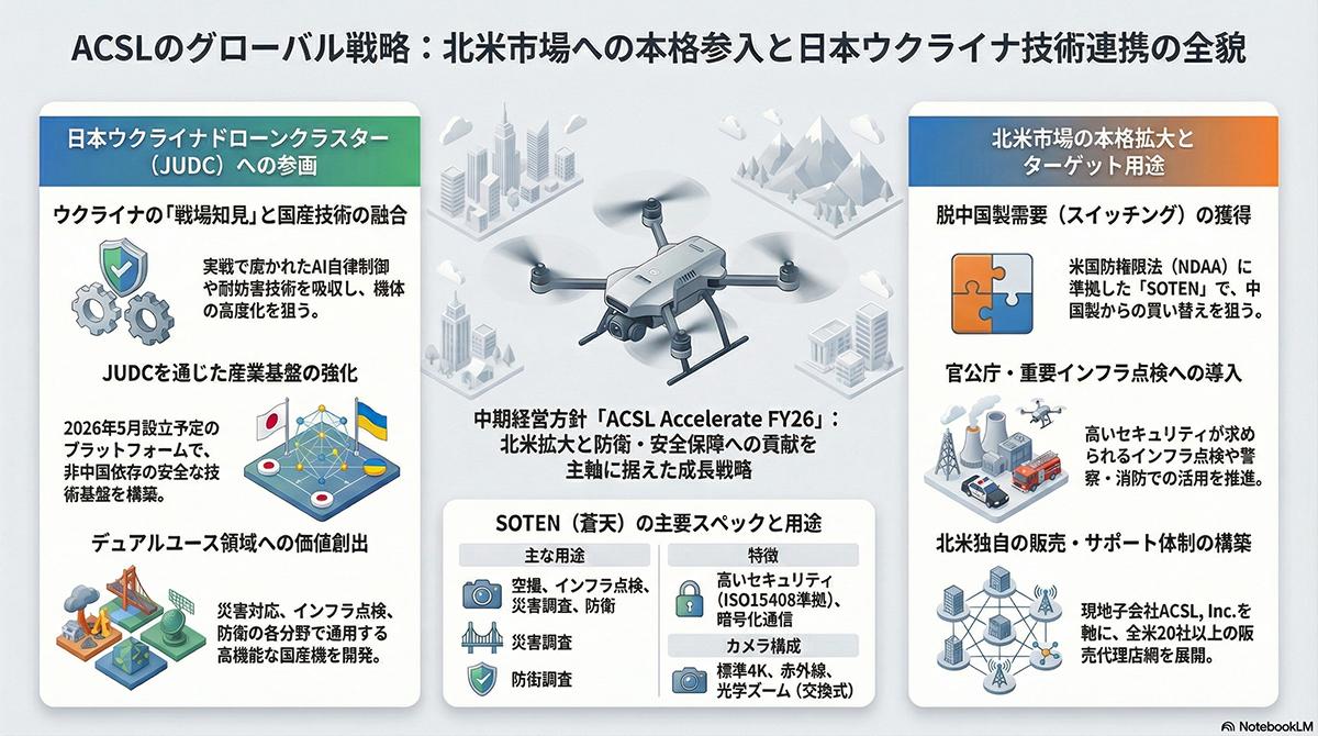 米国では国防権限法(NDAA)などにより中国製ドローンの排除が進んでおり、日本政府も2025年12月にドローンを「特定重要物資」に指定し、国内製造基盤の強化を推進している 。ACSLはこうした市場環境を背景に、安全保障の適合性を備えた国産ドローンの競争力を高め、北米市場での本格的な事業拡大にもつなげる方針。