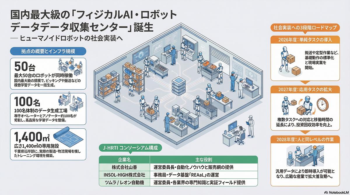 医薬品メーカーのツムラ、機械商社の山善やシステム開発のINSOL-HIGHなど民間企業4社は、ヒューマノイドロボットの産業現場への導入を推進するコンソーシアム「J-HRTI」を設立した。これに伴い、産業用途に特化した日本初となる「フィジカルAI・ロボットデータ収集センター」を2026年7月に開業する。新設されるデータ収集施設は千葉県沿岸部に位置し、敷地面積は約1400平方メートルに及ぶ。施設内では最大50台のヒューマノイドロボットが導入され、同時に稼働する大規模な環境が構築される。約100名のオペレーターやアノテーターが常駐してロボットを操作し、現場の作業を想定した動作データを作成する。このフィジカルデータをロボットのAIに模倣学習させることで、自律制御の精度を高める狙いがある。コンソーシアムには山善、INSOL-HIGHに加え、製薬大手のツムラ、食品機械メーカーのレオン自動機が参画している。INSOL-HIGHが全体設計とデータ基盤運営を担い、山善が運営委員長を務める。背景には、日本の生産年齢人口の減少に伴う製造業や物流分野での深刻な労働力不足がある。単独の企業がロボットの学習データを収集するには多大な投資と時間がかかるため、複数企業が連携して実証環境やデータを共有することで、導入コストを抑えつつ技術的なリスクを分散する。