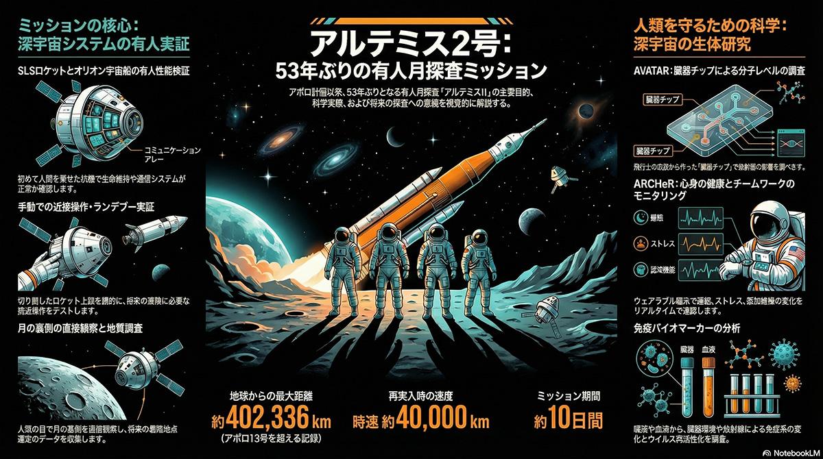 10日間にわたるミッションにおいて、オリオン宇宙船は地球低軌道を離脱し、月の裏側を周回して地球へ帰還する。飛行中、宇宙船は地球から約40万6841キロメートルの距離に到達する予定だ。これは1970年にアポロ13号が記録した40万171キロメートルを上回り、人類史上最も遠い場所への到達記録となる。ミッションの主目的は、無人テスト飛行であったアルテミスIに続き、初めて人間を乗せた状態でSLSとオリオンの性能と安全性を実証することにある。生命維持装置や通信、ナビゲーション機能が宇宙空間で正常に稼働するかを確認するほか、ロケットの上段部分を目標物に見立てた手動での近接操作試験を実施し、将来の宇宙船同士のランデブーやドッキングに必要な技術を検証する。