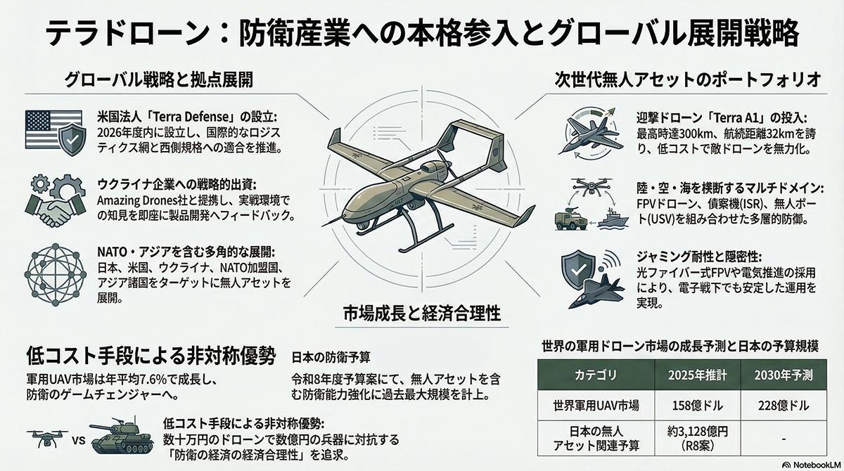 事業展開を支える基盤として、2026年度中に米国法人「Terra Defense(テラ・ディフェンス)」を設立する。同法人は製品の輸出入や各国の防衛産業との技術連携を担い、国際的なニーズに対応する供給体制を構築する。日本国内の多層的沿岸防衛体制への適応に加え、米国や北大西洋条約機構(NATO)加盟国、アジア地域へのグローバル展開を想定している。また、日本政府が同志国の安全保障能力向上を支援する「OSA(政府安全保障能力強化支援)」の枠組みを通じた機体の提供も計画する。
