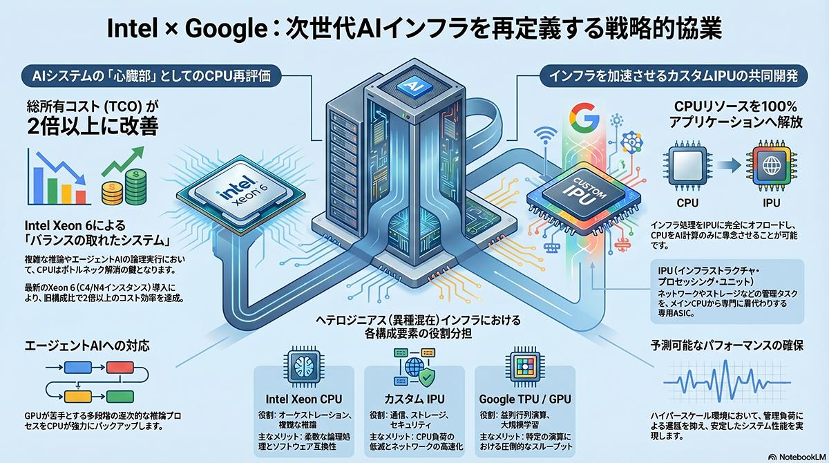 Nvidiaが過半のシェアを握るAIチップ市場において、IntelにとってGoogleとの連携拡大はデータセンター領域における巻き返しの要となる。Google側にとっても、約30年前の自社サーバー構築時から続くIntelとの協業を軸に、膨張するデータセンターの電力消費と運用コストを劇的に抑える狙いがある。AIインフラ競争のステージが移行する中、CPUを中心としたシステム全体の連携構築が改めて問われている。
