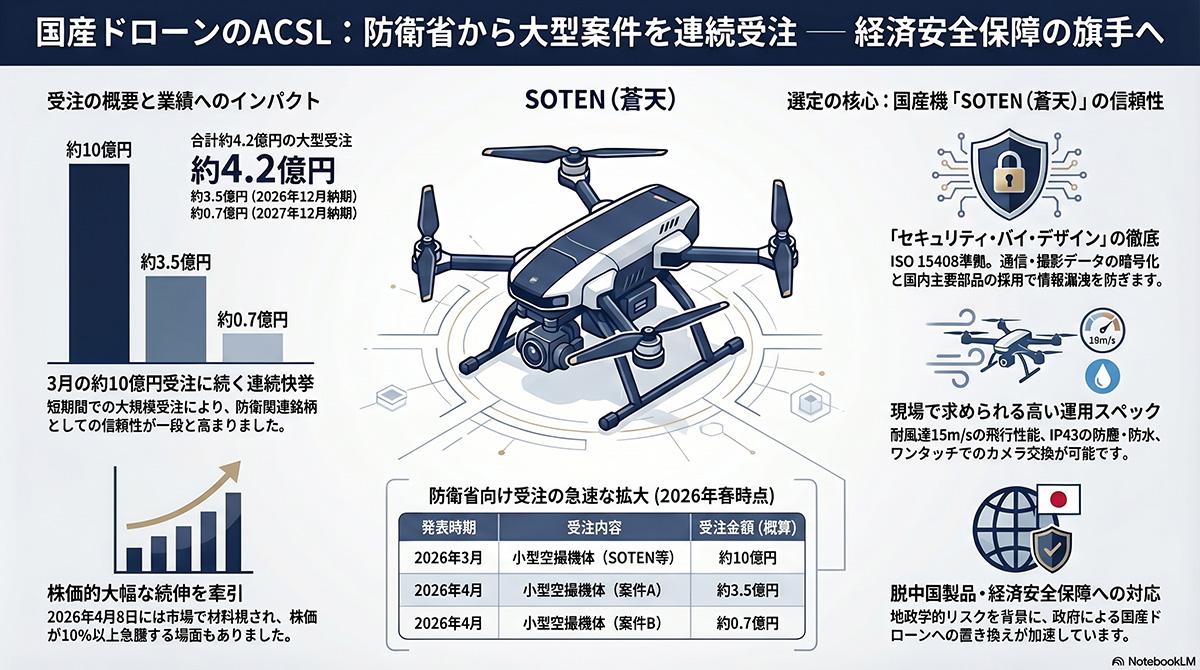 ACSLは中期経営方針において防衛・安全保障分野への貢献を重点戦略に掲げ、国産小型空撮機体「SOTEN(蒼天)」を展開してきた。同機体は情報セキュリティの国際規格に基づいた対策を施し、通信や撮影データの暗号化機能を持つなど、高い情報保全能力を備えている。官公庁や地方自治体向けに運用利便性を高めたパッケージの提供も開始しており、政府調達を想定した製品開発と量産体制の構築を進めている。