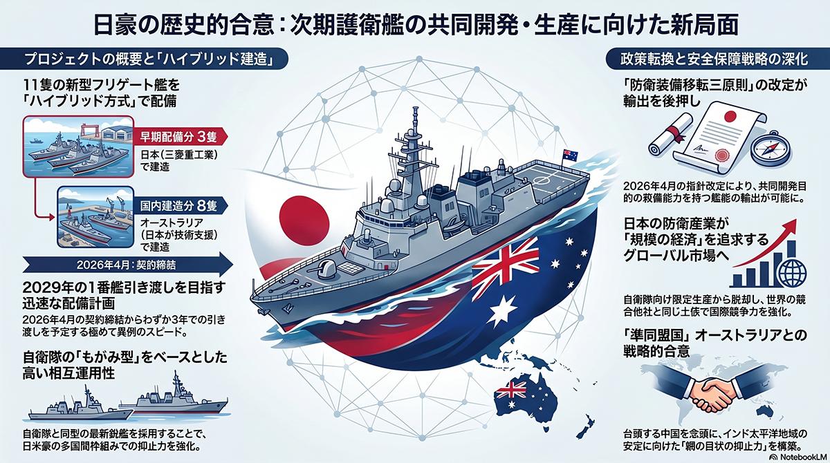 日本とオーストラリアの両政府は2026年4月18日、新型護衛艦の共同開発・生産に向けた正式な契約を締結した。対象となるのはオーストラリア海軍の次期汎用フリゲート艦11隻である。このプロジェクトは、最初の3隻を日本の三菱重工業の造船所で早期に建造し、残りの8隻を日本の技術支援を受けながらオーストラリア国内で建造するという「ハイブリッド方式」を採用している。1番艦の引き渡しは2029年を予定しており、極めて迅速な配備計画となっている。この歴史的な合意の背景には、日本の防衛政策における劇的な転換がある。契約締結直前の2026年4月、日本政府は「防衛装備移転三原則」の運用指針を改定した。これにより、共同開発・生産を目的とする場合に限り、殺傷能力を持つ艦艇の実質的な輸出が事実上可能となった。長年、「自衛隊向けの限定生産」という特殊な環境下で維持されてきた日本の防衛産業は、ついに世界の競合他社と同じ土俵で「規模の経済」を追求できるグローバル市場へと足を踏み入れたのである。