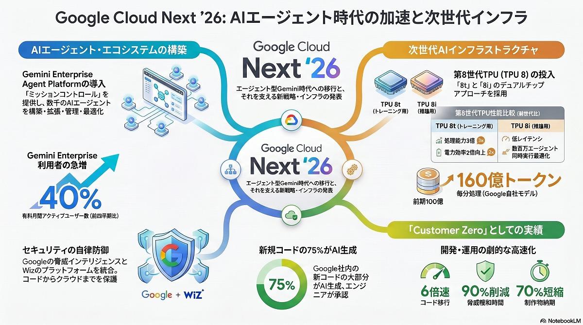 ハードウェアの刷新と同時に、法人顧客向けのソフトウェア群も拡充した。新たに提供される「Gemini Enterprise Agent Platform」は、企業が複数のAIエージェントを一元的に管理し、自社の業務プロセスに組み込むための基盤技術である。開発者は自然言語の指示やフローチャートを用いてエージェントを構築できる。従業員向けのアプリも用意され、日常的な業務の中でエージェントを作成して活用する環境が整えられた。