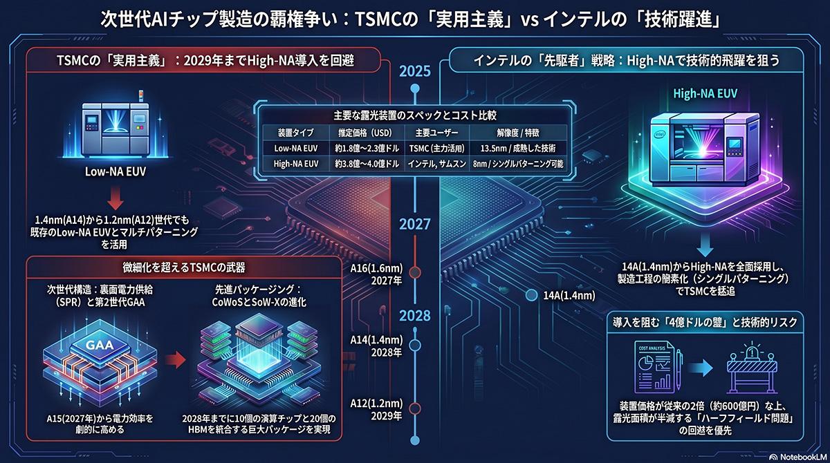 半導体業界における2ナノメートル未満のプロセスノードへの移行において、ファウンドリ各社の戦略は大きく分かれている。競合する米インテルは、ASMLの高NA EUV装置を早期に導入し、自社の次世代プロセスに適用して技術的な優位性の確保を目指している。高NA EUV装置は、光の屈折率を高めることで従来の装置よりも微細な回路を一度の露光で描画できる特長を持つ。これにより製造工程を簡略化できる反面、初期の導入コストが膨大になるという課題がある。