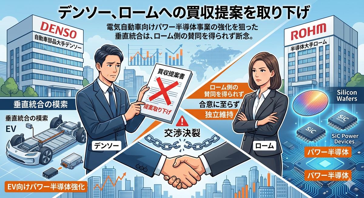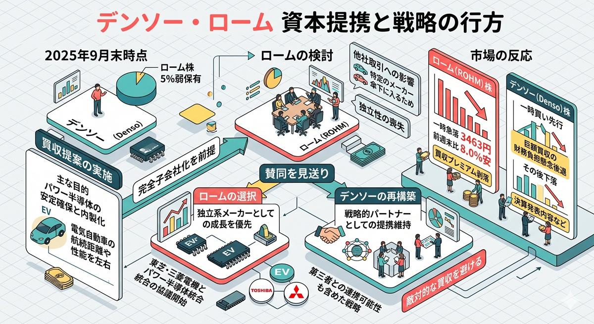 電気自動車の航続距離や性能を左右するパワー半導体の安定確保と内製化が主な目的であった。しかし、ローム側は特定の自動車メーカーの傘下に入ることによる他社との取引への影響や独立性の喪失を懸念し、買収への賛同を見送った。