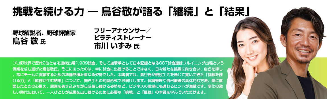本講演では、鳥谷氏が現役生活を通じて貫いてきた「挑戦を続ける力」と「継続が生む結果」について、聞き手との対談形式でお届けします。体調管理や自己鍛錬の具体的な方法、壁に直面したときの心構え、周囲を巻き込みながら成長し続ける姿勢など、ビジネスの現場にも通じるヒントが満載です。