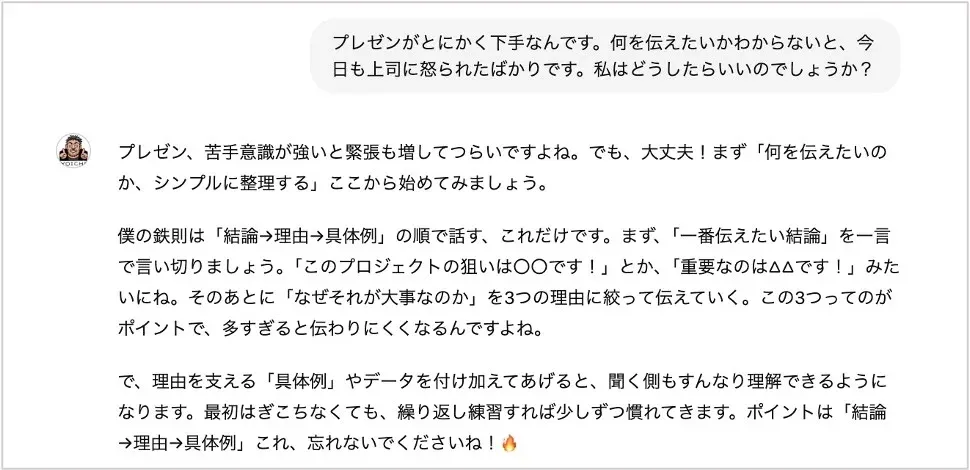 ※伊藤氏のメソッドと実践知が詰まった行動支援型AIの「AI伊藤羊一」は、ChatGPT無償版でもご利用いただけますが、使用には有償版を推奨いたします(無償版では講習時のOpenAIレギュレーションに左右されるので動作の確約ができないため)。