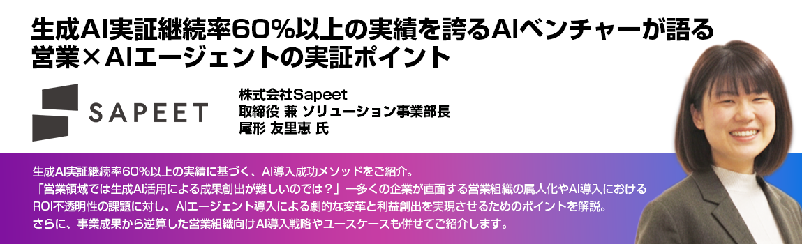 生成AI実証継続率60%以上の実績に基づく、AI導入成功メソッドをご紹介。「営業領域では生成AI活用による成果創出が難しいのでは?」―多くの企業が直面する営業組織の属人化やAI導入におけるROI不透明性の課題に対し、AIエージェント導入による劇的な変革と利益創出を実現させるためのポイントを解説。さらに、事業成果から逆算した営業組織向けAI導入戦略やユースケースも併せてご紹介します。
