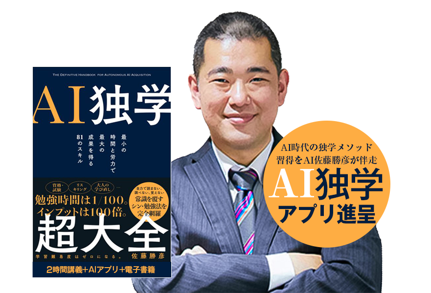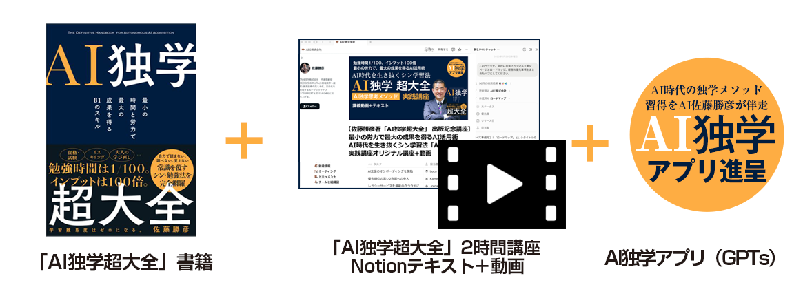 なぜ今「AI独学」なのか?「AIの時代」と言われても、AIをうまく活用できていない。そんな風に感じていませんか?AIツールが期待外れ、知識を言語化できない、アイデアを形にできない、アクションに落としこめない、情報過多で何から手を付けていいか分からない、問題は「AIを使えない」ではなく「AI思考の構造化」ができていないだけなのです。『AI独学 超大全』では、AI時代に必須の「3つのAI独学思考メソッド」を学ぶことができます。AIで瞬時に検索して読む、調べるを完了する「超具体化」、AIで情報を束ね、本質的な法則を抽出する「超抽象化」、理解した本質を体系化し使える技術へと変換する「超構造化」。これらの思考メソッドを習得することで、AIを最高のパートナーとし、経験を教えられる知識に変換、アイデアを確実に実現するアクションに落とし込ます。「AI独学超大全」書籍の価格2,200円で、「AI独学超大全」書籍と著者佐藤勝彦氏から「AI独学思考メソッド」を学ぶ講義、講義内容を繰り返し学習できるnoteテキストと動画、 AI独学思考メソッドの習得を伴走してくれるアプリがセットになっています AI時代を生き抜くシン学習法を学ぶ2時間、ぜひご受講ください。