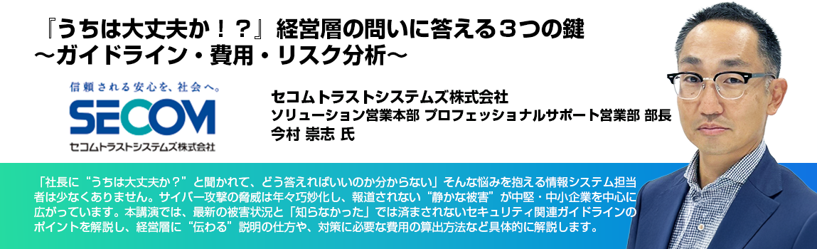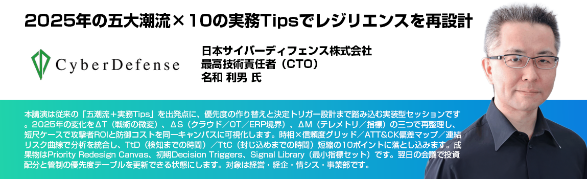 本講演は従来の「五潮流+実務Tips」を出発点に、優先度の作り替えと決定トリガー設計まで踏み込む実装型セッションです。2025年の変化をΔT(戦術の微変)、ΔS(クラウド/OT/ERP境界)、ΔM(テレメトリ/指標)の三つで再整理し、短尺ケースで攻撃者ROIと防御コストを同一キャンバスに可視化します。時相×信頼度グリッド/ATT&CK偏差マップ/連結リスク曲線で分析を統合し、TtD(検知までの時間)/TtC(封じ込めまでの時間)短縮の10ポイントに落とし込みます。成果物はPriority Redesign Canvas、初期Decision Triggers、Signal Library(最小指標セット)です。翌日の会議で投資配分と管制の優先度テーブルを更新できる状態にします。対象は経営・経企・情シス・事業部です。