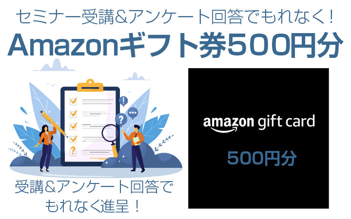 当Webセミナー受講後に表示されるアンケートにお答えいただいた方全員にもれなくAmazonギフト券500円分を進呈いたします。