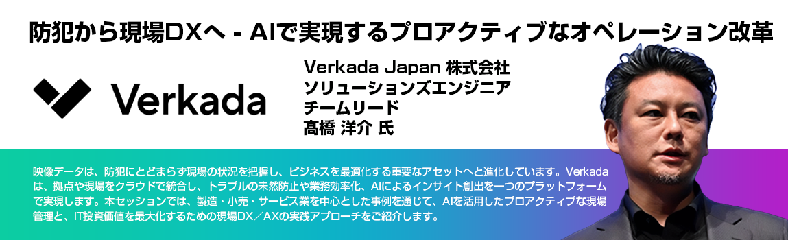 Verkada Japanのソリューションズエンジニア。Verkada入社以前はタニウムの日本/韓国のSE部門の統括責任者、ヴイエムウェアの製品戦略責任者兼スポークスパーソン、アクセンチュアのIT戦略マネージャなどを歴任。20年以上にわたって積み上げてきたIT業界での経験を元に、日々お客様の課題解決に従事。