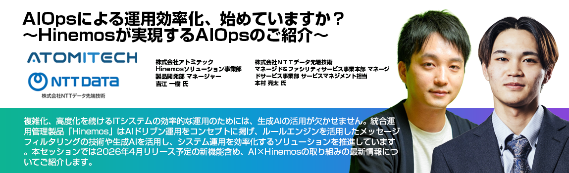 複雑化、高度化を続けるITシステムの効率的な運用のためには、生成AIの活用が欠かせません。統合運用管理製品「Hinemos」はAIドリブン運用をコンセプトに掲げ、ルールエンジンを活用したメッセージフィルタリングの技術や生成AIを活用し、システム運用を効率化するソリューションを推進しています。本セッションでは2026年4月リリース予定の新機能含め、AI×Hinemosの取り組みの最新情報についてご紹介します。