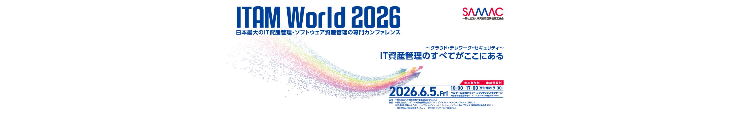一般社団法人 IT資産管理評価認定協会(SAMAC)は、IT資産管理(ITAM)およびソフトウェア資産管理(SAM)に関する最新情報を共有するイベント 「ITAM World 2026」 を、2026年6月5日(金) に東京・西新宿で開催いたします。