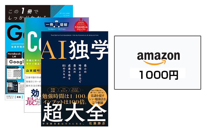 本セミナーにご来場いただき講演アンケートにお答えいただきますと、もれなくAmazonギフト券1000円分を進呈いたします。またセミナー終了後、「AI独学超大全」、「この1冊でしっかりわかる Geminiの教科書」、「Copilotの基本が学べる教科書」などAI関連書籍を200名様にプレゼントいたします。