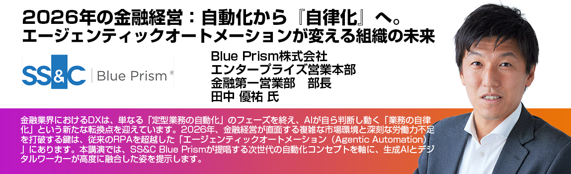 金融業界におけるDXは、単なる「定型業務の自動化」のフェーズを終え、AIが自ら判断し動く「業務の自律化」という新たな転換点を迎えています。2026年、金融経営が直面する複雑な市場環境と深刻な労働力不足を打破する鍵は、従来のRPAを超越した「エージェンティックオートメーション(Agentic Automation)」にあります。本講演では、SS&C Blue Prismが提唱する次世代の自動化コンセプトを軸に、生成AIとデジタルワーカーが高度に融合した姿を提示します。