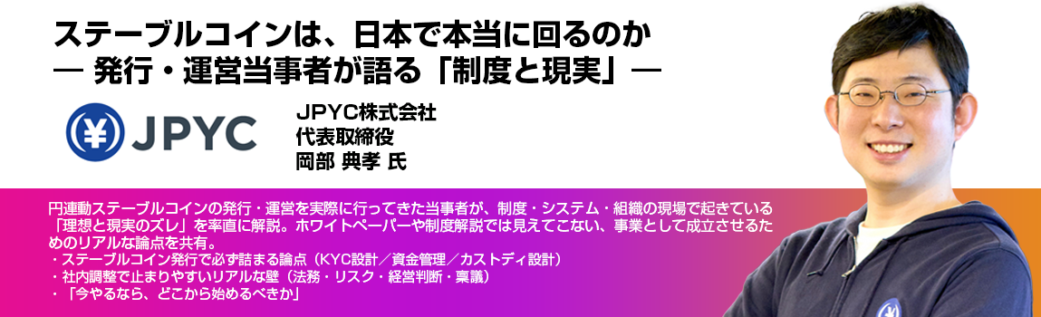 • 円連動ステーブルコインの発行・運営を実際に行ってきた当事者が、制度・システム・組織の現場で起きている「理想と現実のズレ」を率直に解説。ホワイトペーパーや制度解説では見えてこない、事業として成立させるためのリアルな論点を共有。