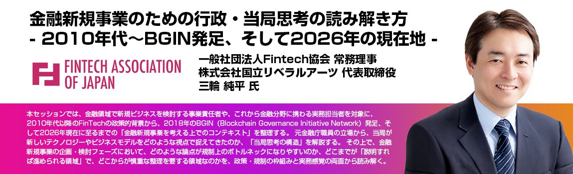 • 本セッションでは、金融領域で新規ビジネスを検討する事業責任者や、これから金融分野に携わる実務担当者を対象に、2010年代以降のFinTechの政策的背景から、2018年のBGIN(Blockchain Governance Initiative Network)発足、そして2026年現在に至るまでの「金融新規事業を考える上でのコンテキスト」を整理する。 元金融庁職員の立場から、当局が新しいテクノロジーやビジネスモデルをどのような視点で捉えてきたのか、「当局思考の構造」を解説する。 その上で、金融新規事業の企画・検討フェーズにおいて、どのような論点が規制上のボトルネックになりやすいのか、どこまでが「説明すれば進められる領域」で、どこからが慎重な整理を要する領域なのかを、政策・規制の枠組みと実務感覚の両面から読み解く。