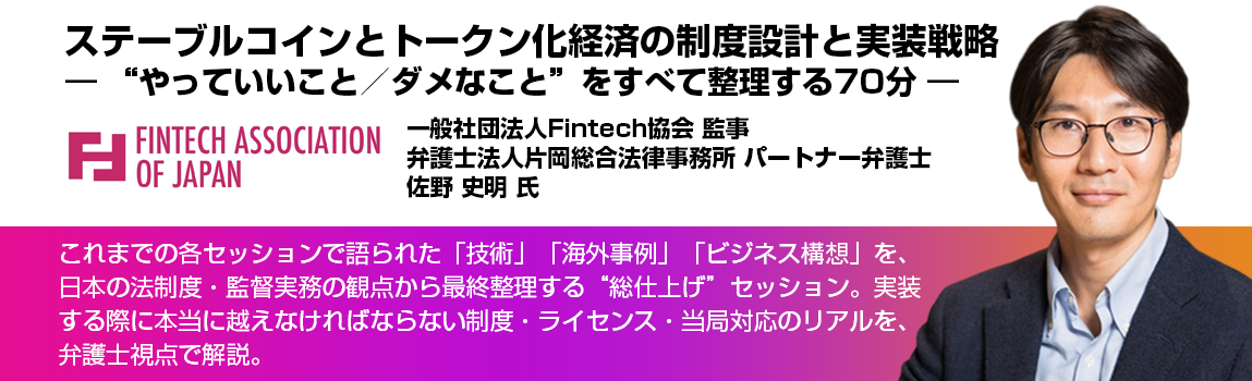 • これまでの各セッションで語られた「技術」「海外事例」「ビジネス構想」を、日本の法制度・監督実務の観点から最終整理する“総仕上げ”セッション。実装する際に本当に越えなければならない制度・ライセンス・当局対応のリアルを、弁護士視点で解説。