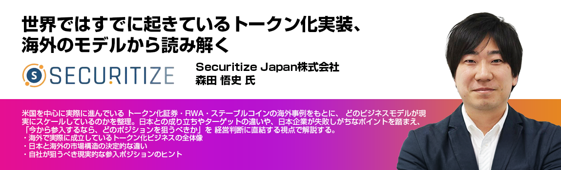 • 米国を中心に実際に進んでいる トークン化証券・RWA・ステーブルコインの海外事例をもとに、 どのビジネスモデルが現実にスケールしているのかを整理。日本との成り立ちやターゲットの違いや、日本企業が失敗しがちなポイントを踏まえ、「今から参入するなら、どのポジションを狙うべきか」を 経営判断に直結する視点で解説する。